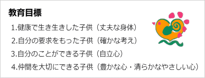 | 漢字教育 | 石井方式を導入し、漢字を教えることが目的ではなく毎日の生活や遊びのなかで漢字を使うことによって知識を啓発し、より可能性を伸ばしていくことを主体と考えます。 |